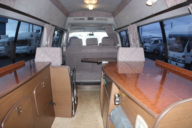 FFヒーター(エンジン停止時使用OK)・リアクーラー(エンジンに連動)・100V家庭用冷暖エアコン・12V冷蔵庫・家庭用電子レンジ・100V電気ポット・シンク・ダブルサブバッテリー・1000wDCACインバーター・100V外部電源引込可(引込コード長約13m)・サイドオーニング・テレビ(地デジ・BS)・USBソケット・荷物室